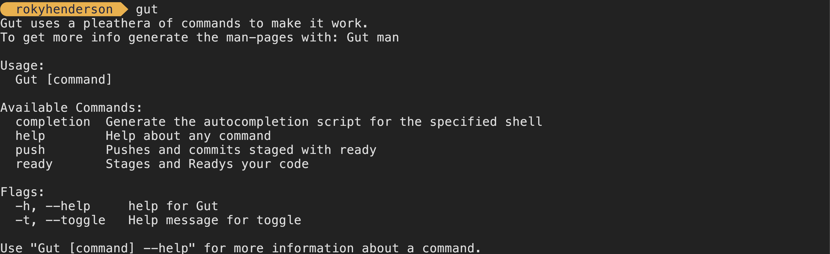 If all has gone right you should have a file called 'Gut' spat out at you. You can make this a command by placing it inside of your '/bin' folder or by using 'go install', however I prefer to use 'alias'. You can use and alias by adding the following to either your '.zshrc' or '.bashrc' file: 'alias gut='your/path/to/gut/file/here' '